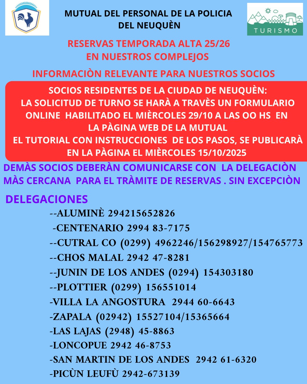 La Mutual del Personal de la Policía del Neuquén informa a sus socios que se encuentra próximo el inicio del proceso de reservas para los complejos turísticos de la institución.